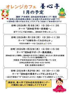 オレンジカフェ「養心亭」では、2024年1月より、外来通院中の方やご家族、地域の皆さまを対象に、講座や講演会を定期的に開催しています。